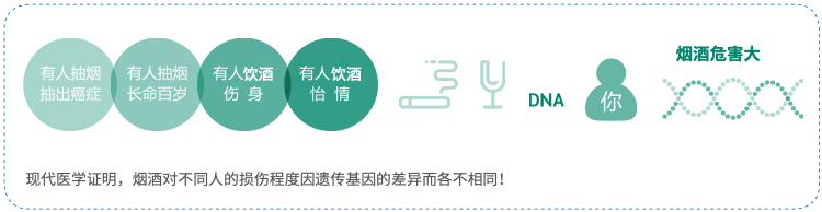 煙酒損傷基因檢測是通過檢測煙酒中的化學物質在人體內代謝過程及對人體的損傷機制相關的基因,包括DNA損傷復基因、癌基因、抑癌基因、毒物代謝酶基因、細胞周期控基因等,通過分析基因檢測結果,評估吸煙增加肺癌、食管癌、胃癌的風險,過量飲酒增加肝癌、食管癌、胃癌的風險,提供相關的健康建議,幫助受檢者盡早戒煙,指導合理、適量飲酒,從而減少吸煙飲酒對身體造成的傷害。