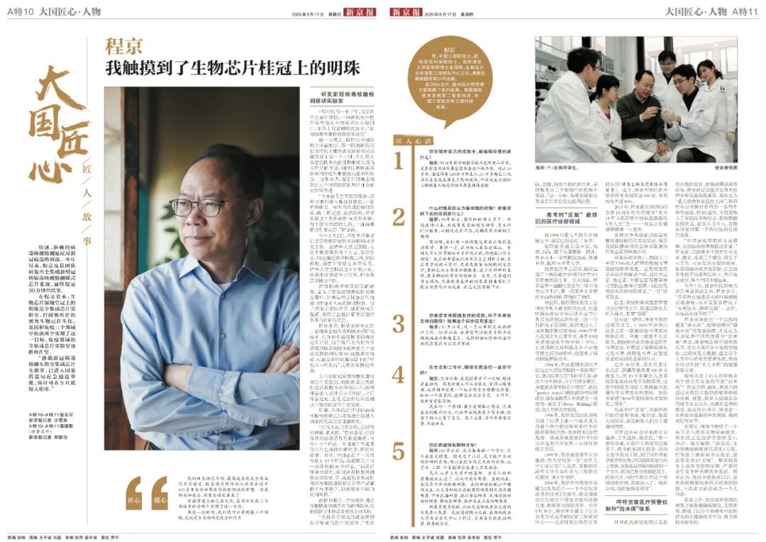 各方凝聚起的“工匠”精神賦予我們跨越山海的底氣。9月17日,新京報推出2020“大國匠心”致敬特刊,其中《匠心·聚力-2020年大國匠心年度人物》特刊A10-11兩整版報道了2020年度大國匠心年度人物-中國工程院院士、清華大學醫學院講席教授、博奧生物集團有限公司總裁程京帶領團隊在新冠肺炎疫情期間攻堅克難、研發多項抗疫核心技術,以及程京院士在過去幾十年為之奮斗不止的“芯路歷程”。