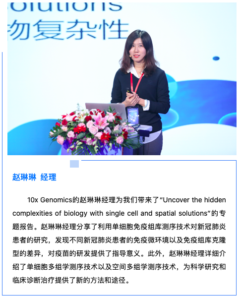 清華大學(xué)醫(yī)學(xué)院研究員、博士生導(dǎo)師,生物芯片北京國(guó)家工程研究中心常務(wù)副主任,博奧生物集團(tuán)有限公司高級(jí)副總裁,北京博奧晶典生物技術(shù)有限公司總裁邢婉麗女士為本次會(huì)議進(jìn)行了開幕式致辭。邢婉麗總裁表示單細(xì)胞測(cè)序技術(shù)及空間轉(zhuǎn)錄組技術(shù)在生命科學(xué)和醫(yī)學(xué)研究領(lǐng)域的應(yīng)用日益受到關(guān)注,為高分辨率研究細(xì)胞分群和組織功能研究提供重要的支撐,對(duì)發(fā)現(xiàn)組學(xué)間關(guān)系、記錄動(dòng)態(tài)生物活動(dòng)具有非常重要的意義,為科學(xué)界和醫(yī)學(xué)界更加深入地去認(rèn)識(shí)生命的本質(zhì),解析胚胎發(fā)育過程、腫瘤發(fā)生發(fā)展、新冠肺炎免疫機(jī)制、發(fā)現(xiàn)新的生物標(biāo)志物和治療靶點(diǎn)等提供全新而絢爛的研究視角。邢婉麗總裁對(duì)所有報(bào)告嘉賓及參會(huì)嘉賓的到來表示熱烈歡迎及衷心感謝!