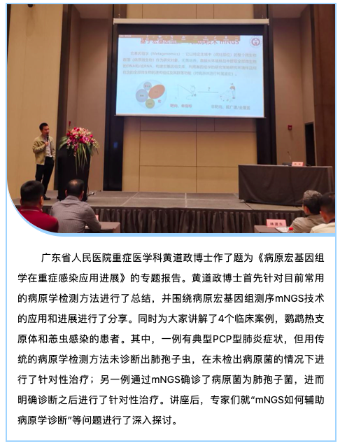 日前,福建省重癥醫學培訓會——中國重癥醫學多學科精髓(MCCRC)培訓班在福州召開。本次培訓班邀請了省內外知名專家圍繞重癥醫學領域新技術的發展等內容進行了專題報告,其中,廣東省人民醫院重癥醫學科黃道政博士及博奧晶典產品總監劉瑩瑩博士受邀出席,并作了題為“病原宏基因組學在重癥感染應用進展”和“病原宏基因組學報告解讀”的專題報告,報告受到福建省醫學會重癥醫學分會主任委員、福建醫科大學附屬第一醫院ICU主任林建東教授的支持與點評。