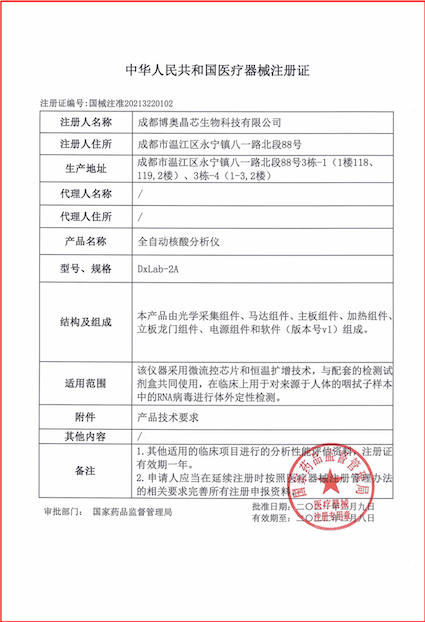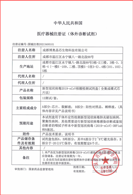 2021年2月10日,恰逢新春佳節來臨之際,依托國家科技部應急攻關項目,博奧聯合清華大學成功研發的由新型冠狀病毒2019-nCoV核酸檢測試劑盒(全集成碟式芯片法)(國械注準:20213400101)和全自動核酸分析儀(國械注準:20213220102)組成的全集成芯片實驗室獲國家藥監局應急審批批準,為全國新冠肺炎疫情防控提供現場快速檢測“芯”利器。