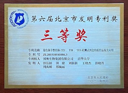 4月20日上午,京津冀促進知識產權運用工作會暨北京市發明專利獎頒獎大會在京舉行,博奧生物集團聯合清華大學的“染色體非整倍體(T21、T18、T13)檢測試劑盒的質控品及其應用”發明專利喜獲三等獎,彰顯了博奧生物在無創產前基因檢測技術上的先進優勢。