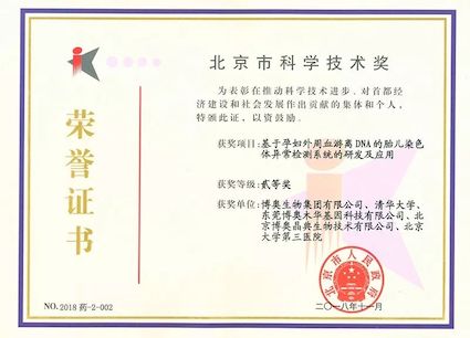 另外,與本產品相關的“基于孕婦外周血游離DNA的胎兒染色體異常檢測系統的研發及應用”榮獲2018年度北京市科學技術獎二等獎。