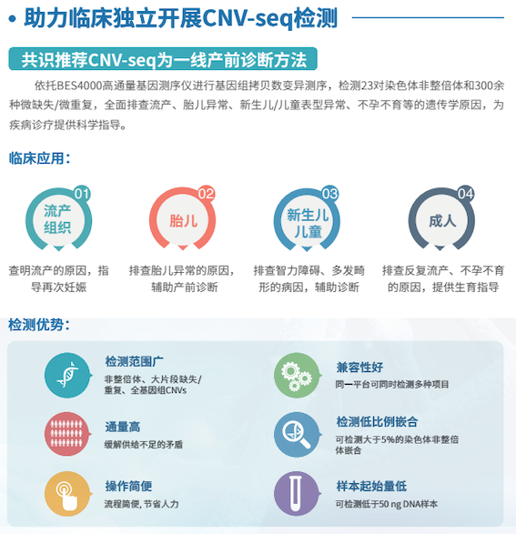 王教授詳細(xì)介紹了博奧基于BES4000平臺的CNV-seq技術(shù),指出在產(chǎn)前診斷領(lǐng)域引入STR(short tandem repeat,短片段重復(fù)序列)分析的CNV-seq(+)技術(shù),不僅可有效排除母源污染,還可高效檢出三倍體和UPD,提高陽性檢出率。2019年4月發(fā)布的《低深度全基因組測序技術(shù)在產(chǎn)前診斷中的應(yīng)用專家共識》指出,具備條件的產(chǎn)前診斷機(jī)構(gòu)可將CNV-seq作為一線產(chǎn)前診斷技術(shù)應(yīng)用于臨床。CNV-seq技術(shù)不僅能輔助臨床判斷胎兒是否存在染色體異常,還能提高復(fù)發(fā)性流產(chǎn)夫婦染色體異常檢出率。