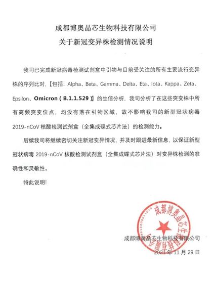 目前,旗下成都博奧晶芯生物科技有限公司已完成新冠病毒檢測試劑盒中引物與目前主要流行變異株的序列比對【包括但不限于:Alpha、Beta、Gamma、Delta、Eta、Iota、Kappa、Zeta、Epsilon、Omicron(B.1.1.529)】,結果證實:博奧晶典已上市的新型冠狀病毒2019-nCoV核酸檢測試劑盒(全集成碟式芯片法),不會出現脫靶和漏檢的情況。后續,博奧晶典將持續緊密追蹤全球新冠病毒變異株的最新動態并及時跟進最新信息,確保全集成新冠病毒核酸檢測芯片試劑盒對變異株檢測的準確性和靈敏性。