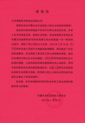 我縣諾爾鎮貧困殘疾戶學生xxx父親雙目失明,其本人先天性高度近視,家庭生活貧困。在我縣殘聯及本地企業內蒙古哈維斯特農牧科技有限公司對其家庭一對一幫扶的過程中,得到了貴公司的大力支持。2022年2月18日,xxx同學在貴公司進行生物基因檢測期間,貴司減免了其全部檢測費用,并且得到了貴司員工悉心的照顧和幫助。是你們熱情的問候以及無私的援助,讓xxx同學感受到社會大家庭的溫暖,讓她有戰勝疾病克服困難的決心和意志。貴司專業的服務和先進的基因檢測技術,對xxx同學及其家庭未來的生活有很大幫助。貴司的仁愛之心和社會責任感為和諧社會做出了優秀的榜樣!