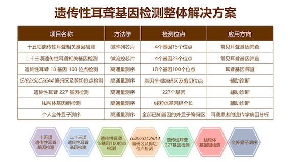 博奧晶典遺傳性耳聾相關基因檢測芯片的不斷升級迭代,有助于篩查出更多致聾基因變異人群,盡早為其提供生活指導,降低耳聾發生風險,早診斷、早干預、早治療。目前,博奧晶典已推出基于微陣列芯片、微流控芯片及高通量測序平臺一系列產品及服務,包括:十五項遺傳性耳聾基因檢測、二十三項遺傳性耳聾相關基因檢測、藥物性耳聾基因檢測、遺傳性耳聾基因檢測(100項)、遺傳性耳聾基因檢測(227個基因)、線粒體基因組檢測、全外顯子組基因檢測等,為備孕期及孕早期夫婦、新生兒及聽障人群提供最佳的篩查、診斷方案,同時提供專業的報告解讀及后續遺傳咨詢服務,以實際行動全面助力耳聾三級防控,減少聾兒的發生。