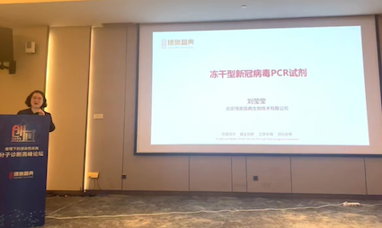 博奧晶典產品總監劉瑩瑩博士作了題為《凍干型新冠病毒PCR試劑》的主題報告。作為今年即將重磅上市的嶄新產品,凍干型新冠病毒PCR試劑實現了技術上的重大突破。與液體試劑相比,預封裝的凍干試劑,省空間、省人力、省耗材、省時間,最快可在40分鐘內完成擴增檢測,滿足臨床對樣本質量及檢測過程的全程監控,靈敏度高達150拷貝/毫升,確保結果準確可靠。同時,劉瑩瑩博士講到,包含全集成芯片實驗室系統、全集成新冠病毒核酸檢測移動實驗室、全自動分杯系統、全自動核酸提取純化儀在內的博奧晶典新冠病毒核酸檢測整體解決方案,可為疫情防控提供多重保障。