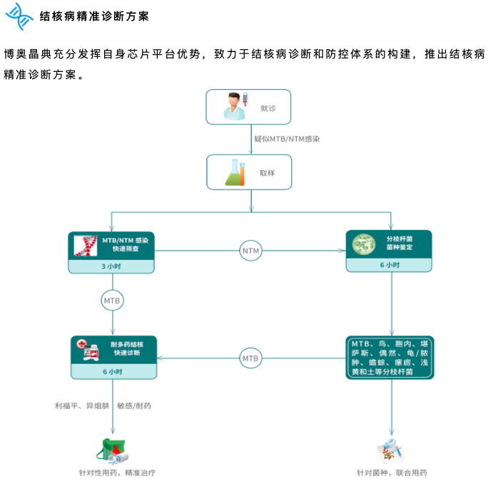 結核病精準診斷方案中包含:分枝桿菌核酸檢測試劑盒(PCR-熒光探針法)、分枝桿菌菌種鑒定試劑盒(DNA微陣列芯片法)、結核分枝桿菌耐藥基因檢測試劑盒(DNA微陣列芯片法)。這三款診斷產品,環環相扣,涵蓋了結核快速篩查、菌種鑒定、耐多藥結核病快速診斷,構成了晶芯®結核病快速分子診斷系統。結核診斷、輔助用藥全面覆蓋,真正實現結核全程分子監控。