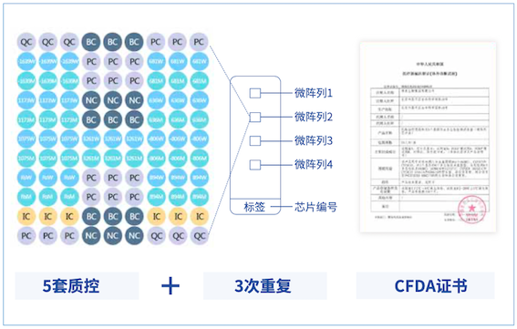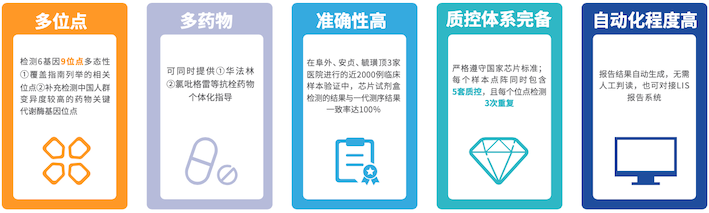 抗栓治療用藥相關6個基因位點多態性檢測試劑盒(微陣列芯片法)采用多重等位基因序列特異性PCR結合通用微陣列芯片(Allele-Specific PCR-based Universal Array,ASPUA)方法,對人基因組DNA中VKORC1、CYP2C9、CYP4F2、GGCX、CYP2C19和CYP3A4這6個基因的9個多態性位點進行檢測。