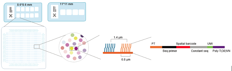 芯片包括兩種類型:組織透化芯片和基因表達芯片,表達芯片捕獲區域面積為11*11mm。在捕獲區域內存在著數千萬的探針簇,每個探針簇的直徑為0.8 μm,每平方微米有約18000 條探針,用于捕獲轉錄本(圖1)。每條探針捕獲序列由5 部分組成 :