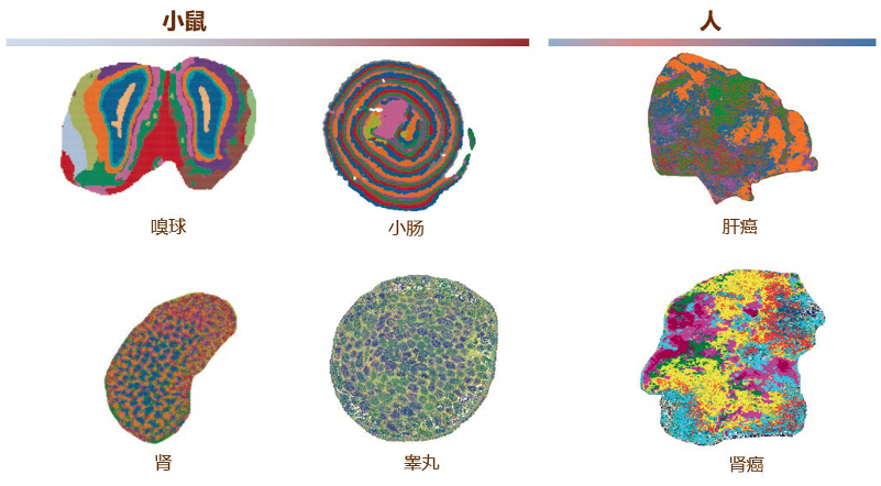 目前對人和小鼠的多種組織,包括嗅球、小腸、腎臟、肝等進行空間轉錄實驗,繪制各種細胞類型在組織中的精細空間分布(圖4)。